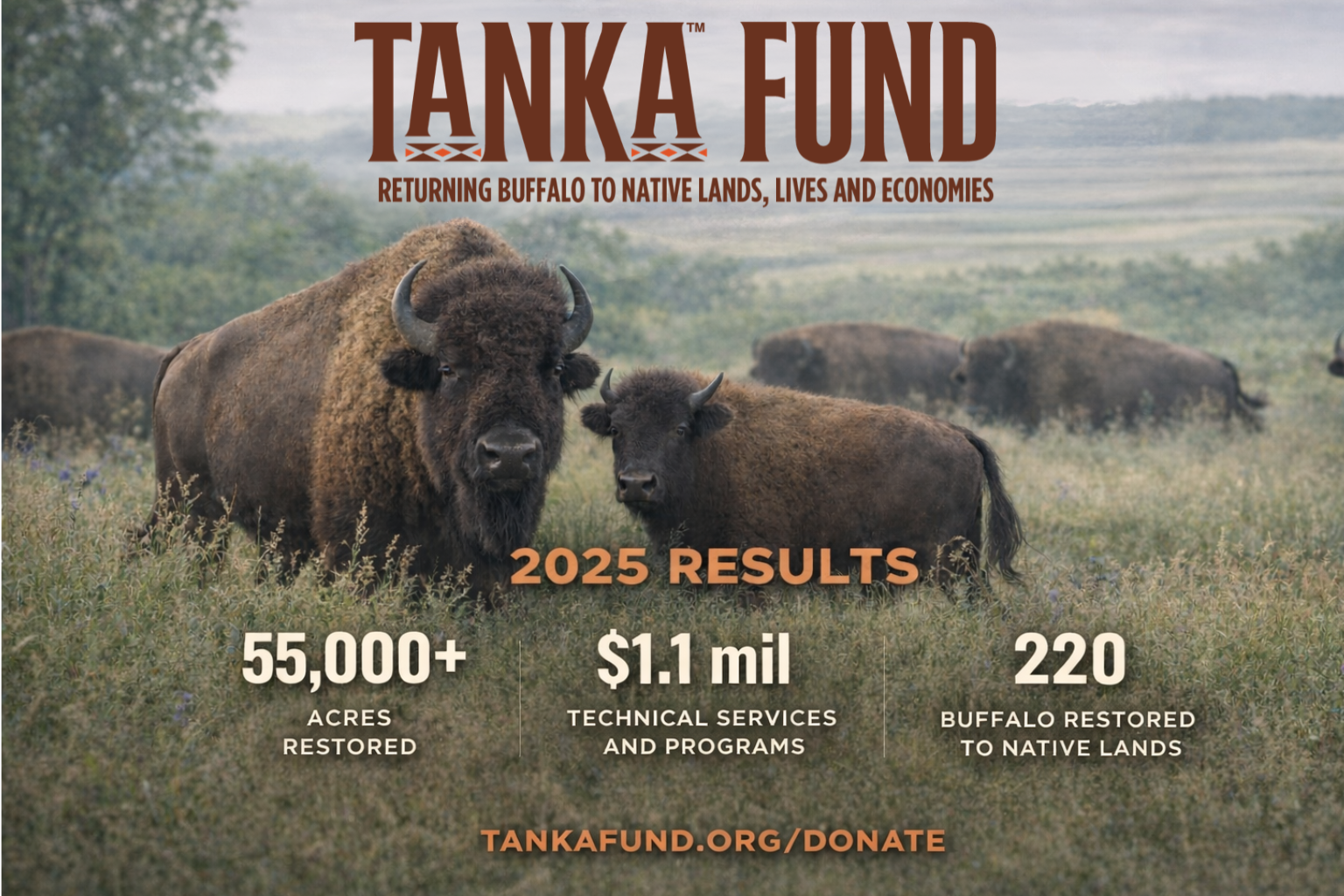 In one of the most challenging years to date, your support powered real, measurable impact. In 2025, Tanka Fund provided $1.1 million in technical services and programs to 22 active ranchers and helped return 220 Buffalo to Native caretakers across more than 55,000 acres in eight states. Infrastructure was built, herds were established, and families strengthened their role as caretakers. The work is far from finished, and together we can ensure the next 220 Buffalo find their way home.